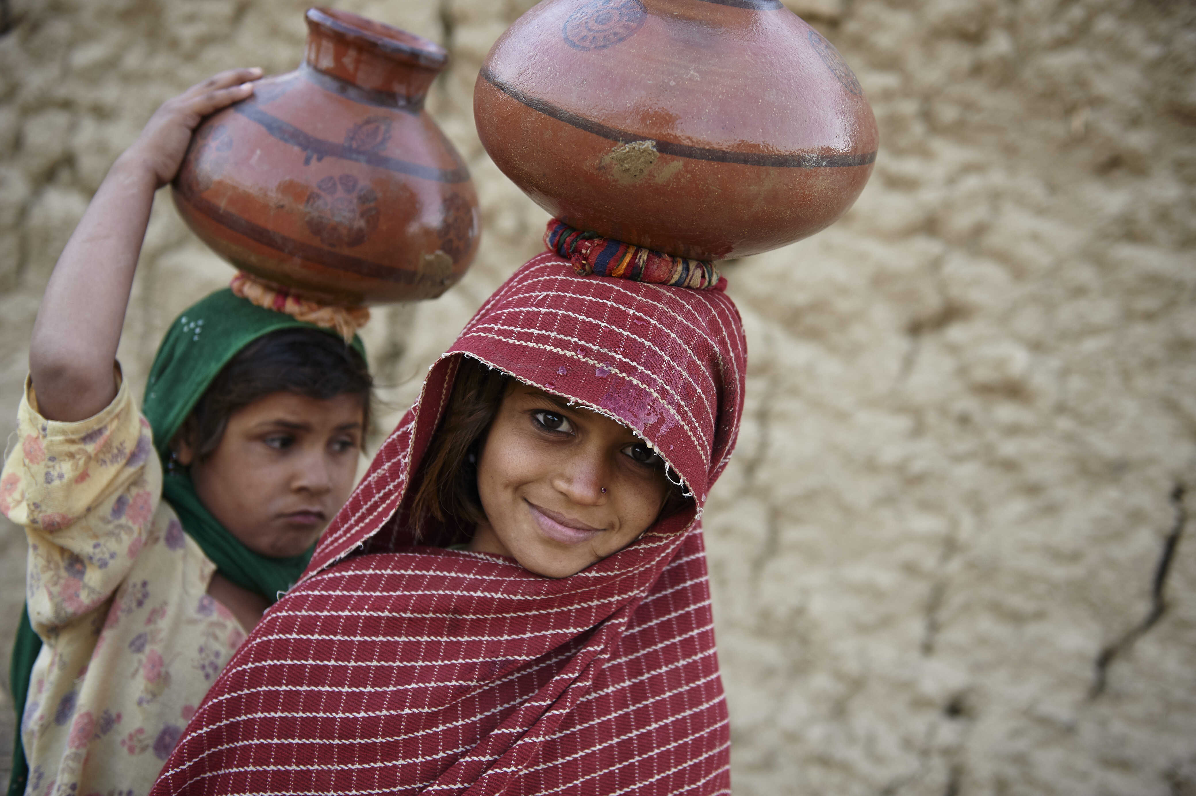 The burden of house chores invariably falls on women and young girls in rural Pakistan. These girls are on their way home after collecting water in traditional pots from an underground supply pipeline in the village of Sadra Sharif, Dera Ismail Khan district.